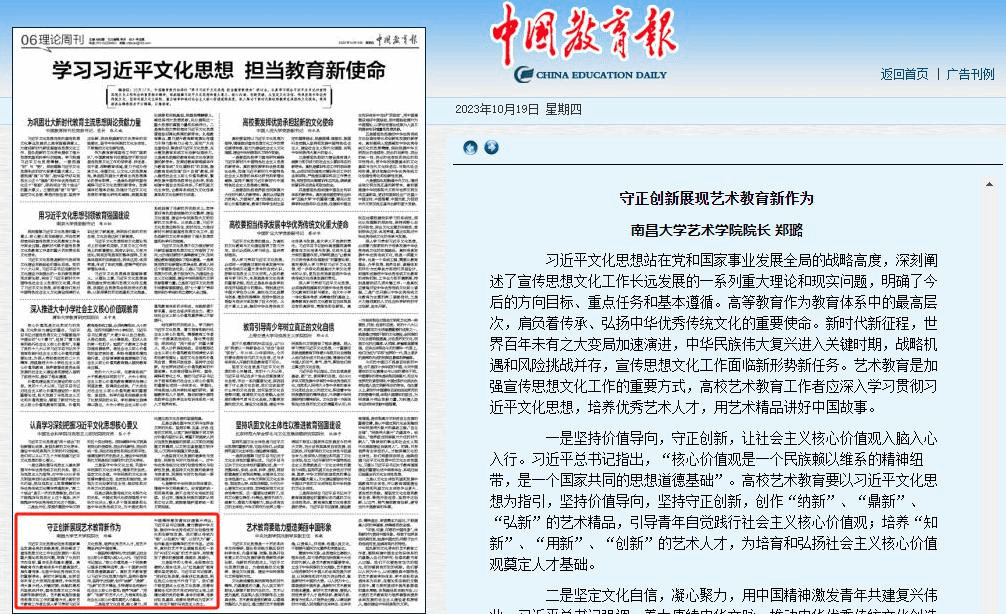 编者按:10月19日,《中国教育报》06版理论周刊刊发《学习习近平文化思想 担当教育新使命》报道,其中以《守正创新展现艺术教育新作为》为题,刊载我校艺术学院院长郑璐学习领会习近平总书记对宣传思想文化工作作出的重要指示精神体会文章。详情如下: