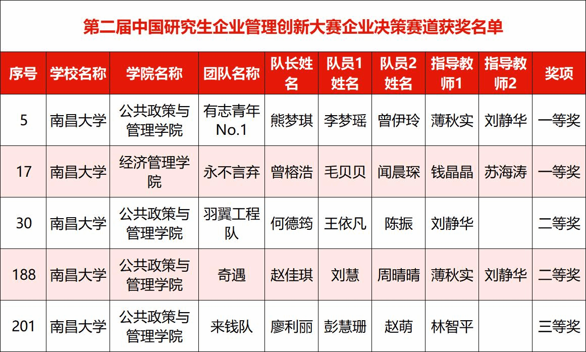 我校7支队伍在本次大赛中的获奖等级和数量均创历史新高,彰显了南昌大学研究生培养所取得的阶段性成果。南昌大学将持续推动研究生教育教学改革,深化专业学位产教融合深度和广度,在凸显项目办学特色的同时推动研究生教育高质量内涵式发展,为地方经济和国家建设培养更多优秀的管理人才。