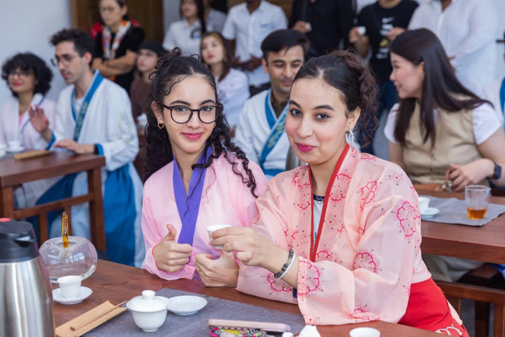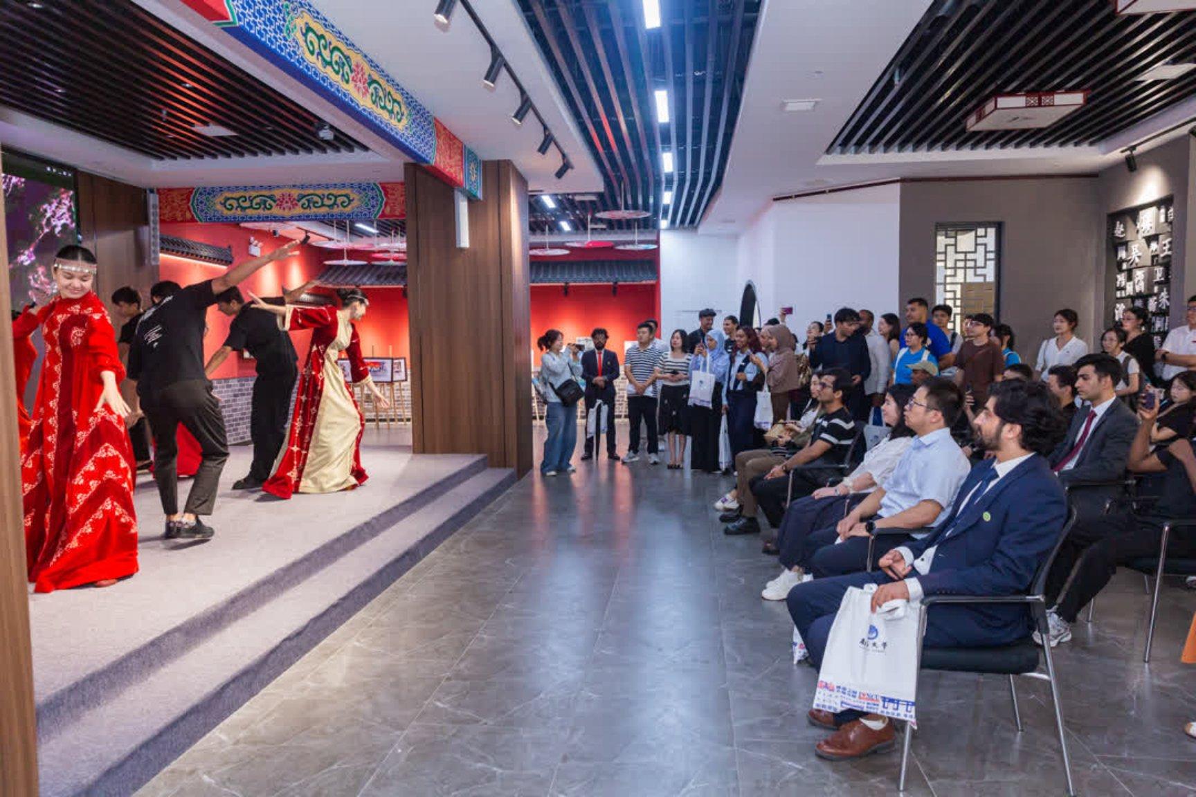 颁奖仪式后,参会师生共同前往南昌大学国际教育学院参观交流,深入了解学院在留学生培养模式与中外文化交流活动方面的开展情况。参观过程中,中外师生欣赏了舞蹈表演,体验了中国传统茶艺,在清香四溢的茶汤中体会东方文化的韵味与礼仪。中外学子积极互动,友谊在交流中进一步深化。