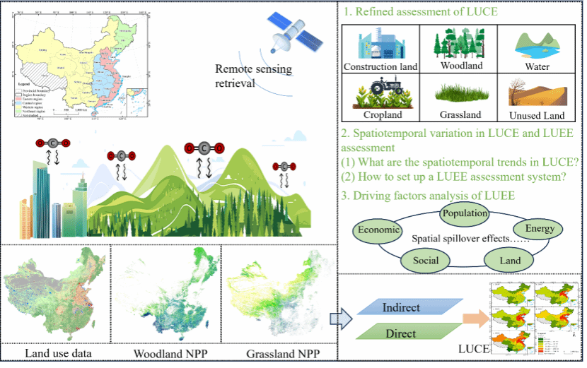 该研究针对现有省级尺度碳排放评估中存在的数据精度不足与机制分析薄弱等问题,实现了多重突破。一是框架创新,实现精准核算。研究融合多源遥感数据(如植被净初级生产力NPP)、高分辨率土地利用数据与社会经济统计数据,构建了一个改进的多参数动态核算模型。该模型显著提升了中国各省份碳排放核算的准确性,尤其优化了林地、草地等关键碳汇的空间异质性表征,克服了传统IPCC系数法的局限性。二是揭示动态逆转与空间分异格局。系统评估发现,2000—2020年间,中国土地利用碳排放总量增长了2.16倍,并在2005—2010年间经历了从碳汇到碳源的关键性逆转。空间上,碳排放效率呈现出鲜明的“东部高效、西部低效”的阶梯式分布格局,揭示了区域发展与碳排放脱钩程度的显著差异。三是洞察空间溢出效应,解锁协同治理路径。研究首次在省级尺度上应用空间杜宾模型,深入揭示了土地利用碳排放效率驱动因素的空间溢出效应。研究发现,土地利用强度、产业结构(第二产业占比)和能源强度等因素不仅影响本地效率,更会产生显著的跨区域影响,这为打破行政壁垒、推动区域协同减排提供了全新的理论视角和实证支撑。