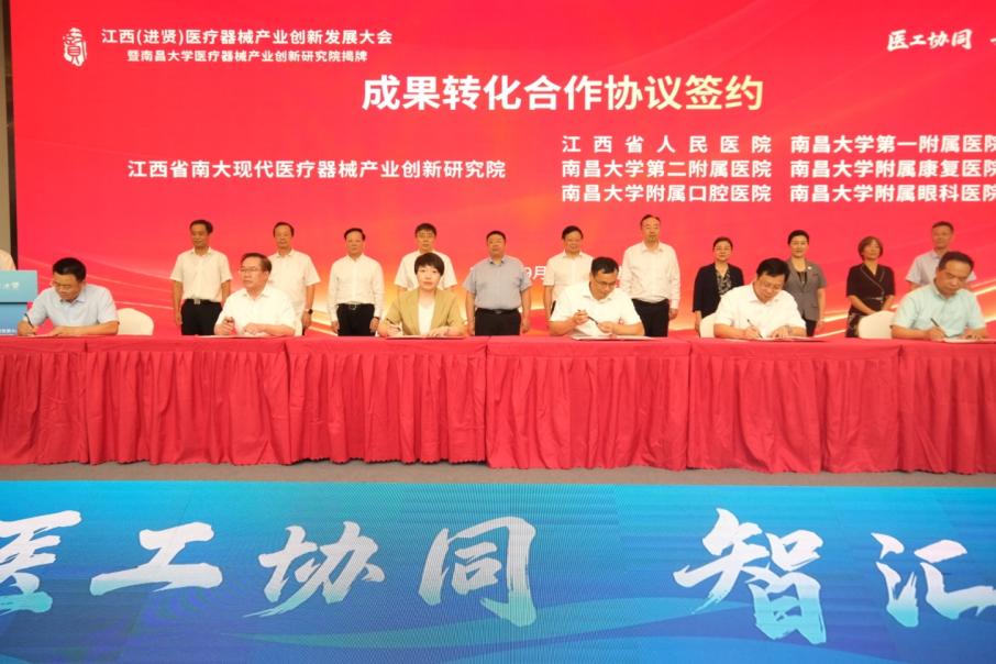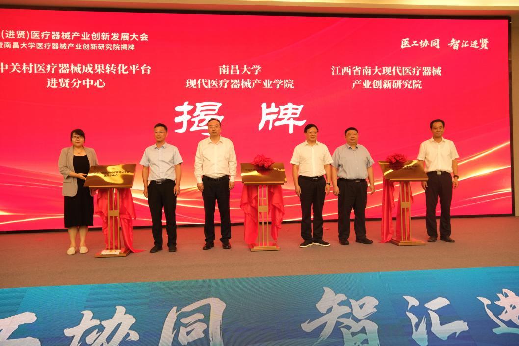本网讯(先进制造学院)近日,江西(进贤)医疗器械产业创新发展大会暨南昌大学医疗器械产业创新研究院揭牌在进贤县举行。校党委书记罗嗣海,南昌市委常委、副市长马煜洲,江西省工信厅党组成员、副厅长江绍龙,省药监局党组成员、副局长吴腮忠等共同为南昌大学现代医疗器械产业学院、江西省南大现代医疗器械产业创新研究院、中关村医疗器械成果转化平台进贤分中心揭牌。
