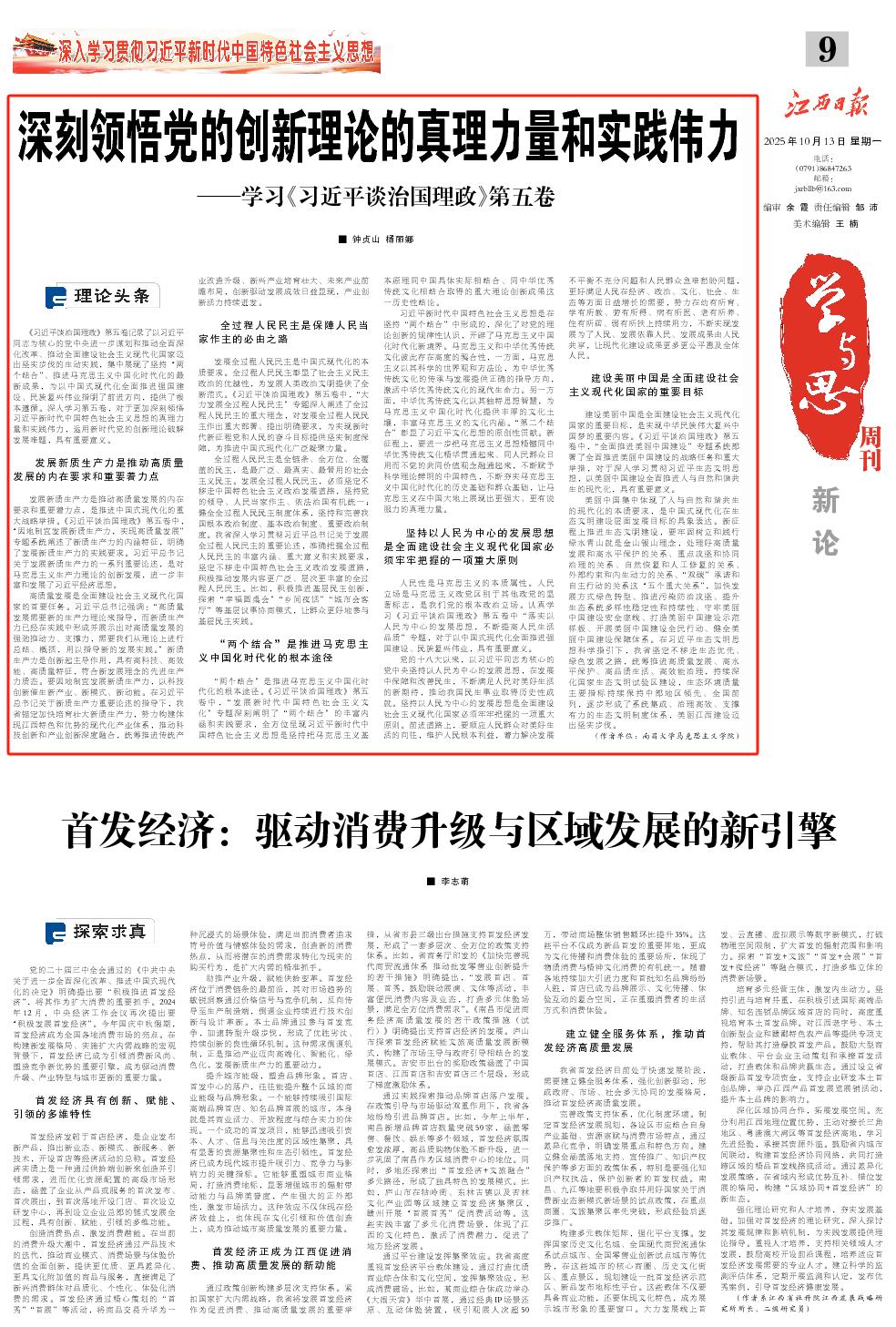 编者按:10月13日,《江西日报》“学与思”周刊以《深刻领悟党的创新理论的真理力量和实践伟力》为题刊登我校马克思主义学院钟贞山、杨丽娜撰写的理论文章,详情如下: