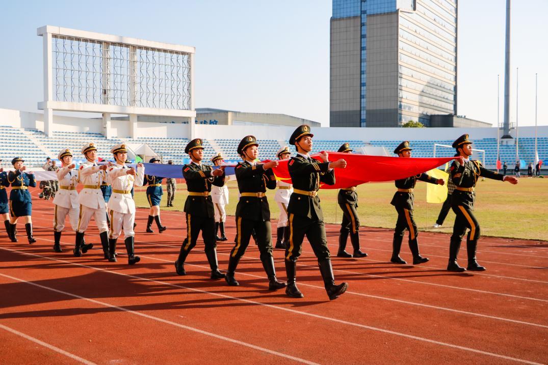 国旗护卫队的队员们身姿挺拔,目光坚毅,以整齐而坚定的步伐护送着国旗、校旗与运动会会旗入场。紧随其后的鲜花方阵、彩旗方阵及各学院运动员代表方阵依次行进,同学们神采奕奕、意气风发,运动场上处处跃动着青春的活力。