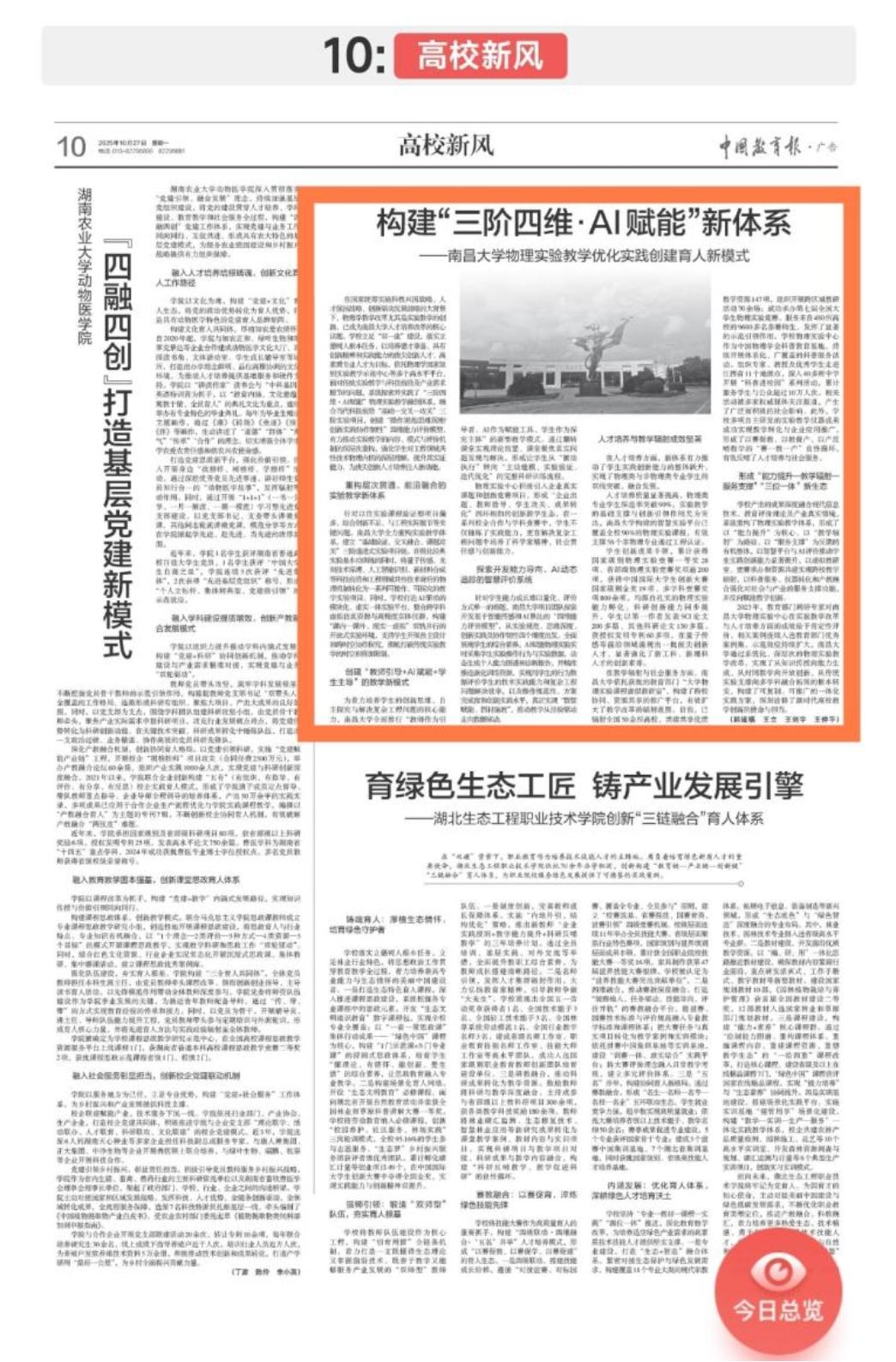 编者按:10月27日,《中国教育报》刊发题为《构建“三阶四维·AI赋能”新体系——南昌大学物理实验教学优化实践创建育人新模式》的文章,报道我校推进物理学教学改革尤其是实验教学创新,创建育人新模式。详情如下: