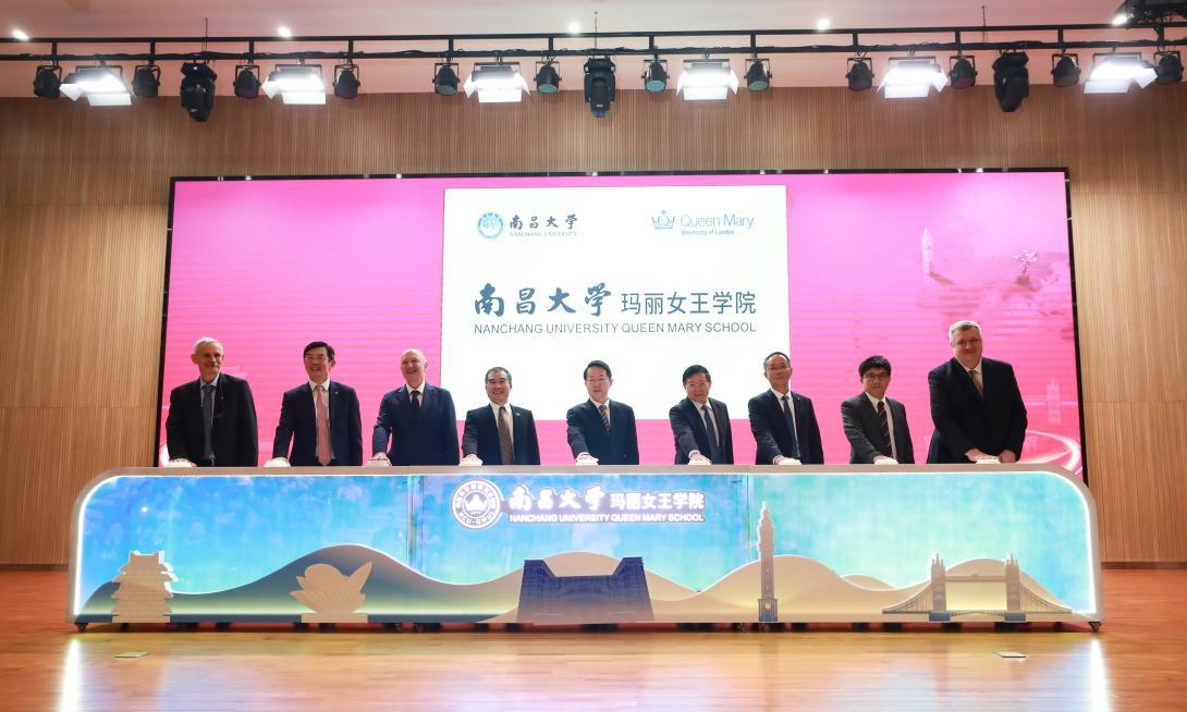 葛刚宣读教育部批准文件,郑磊、罗嗣海、陈晔光、李庆红、Colin Bailey、Wen Wang、南昌大学玛丽女王学院院长罗志军、Mike McCourt、伦敦玛丽女王大学中英联合项目主任Mark Maconochie共同为南昌大学中外合作办学机构揭牌。
