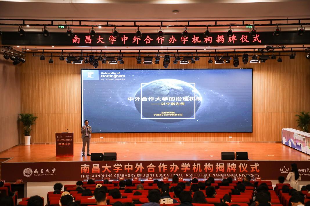 本网讯(记者朱文芳)11月10日,南昌大学中外合作办学机构揭牌仪式举行,江西省教育厅厅长郑磊,南昌大学党委书记罗嗣海,南昌大学校长陈晔光院士,江西省发展和改革委员会副主任李庆红,英国皇家工程院院士、伦敦玛丽女王大学校长Colin Bailey,英国皇家工程院院士、伦敦玛丽女王大学副校长Wen Wang,南昌大学副校长葛刚,宁波诺丁汉大学党委书记沈伟其,英国驻广州总领事馆中国区生命科学及医疗行业副主任Mike McCourt,各省直单位和兄弟高校的领导专家共同到场见证。南昌大学副校长王立、潘秉兴分别主持活动。
