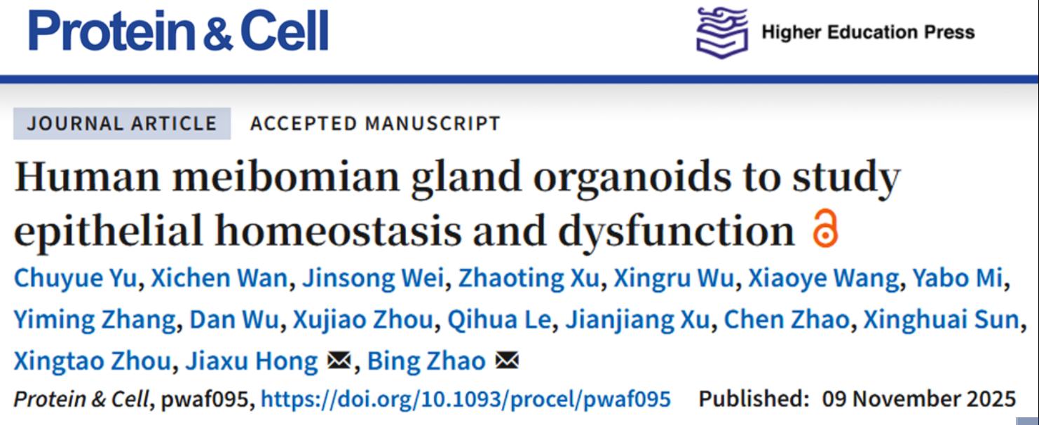 赵冰团队在睑板腺类器官与干眼症模型研究方面取得重要突破,于Protein & Cell杂志发表题为“Human meibomian gland organoids to study epithelial homeostasis and dysfunction”的研究文章,从头构建了可长期稳定扩增的小鼠及人睑板腺类器官,于体外完整还原了睑板腺细胞谱系及脂质分泌功能。