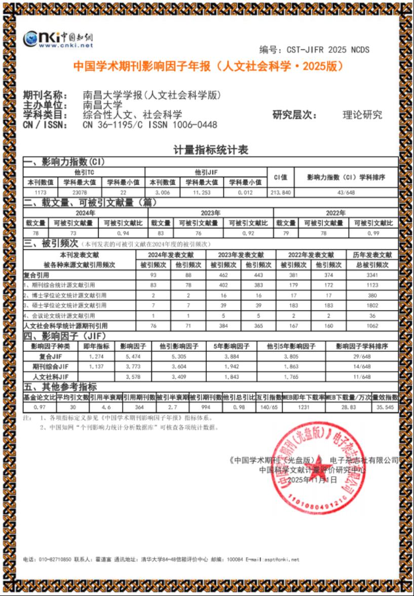 本网讯(期刊社)近日,中国科学文献计量评价研究中心《中国学术期刊影响因子年报(人文社会科学·2025版)》数据显示,《南昌大学学报(人文社会科学版)》2024年的各项影响力指标再创历史新高,复合影响因子首次突破5.0,达到5.474,较去年的3.179增长了72.19%,在全国648个综合性人文、社会科学期刊中影响因子指数学科排名从去年65位进位至29位。期刊影响力指数为213.480,在全国综合性人文、社会科学期刊中排名第43位,排名从去年的94位进位到43位,继续位于Q1区。