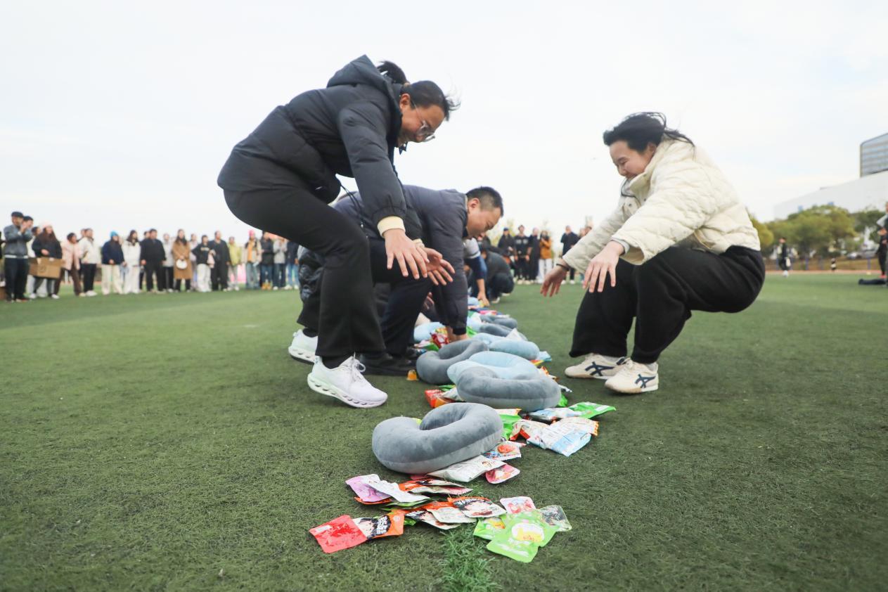 趣味游戏环节更是妙趣横生,高潮迭起。“蜈蚣竞走”考验团队默契,队员们需身体抵住气球连贯前行,姿态各异,趣味十足;“不倒森林”聚焦专注与同步,队员们围圈快速移动,稳接长杆,场面紧张有序;“一起向未来”则模拟龙舟竞速,六人一组的“龙舟”在有序的口号声中协调步伐,奋力冲向终点。而“零食大作战”则将现场气氛推向另一个高潮,现场掌声、笑声不断。
