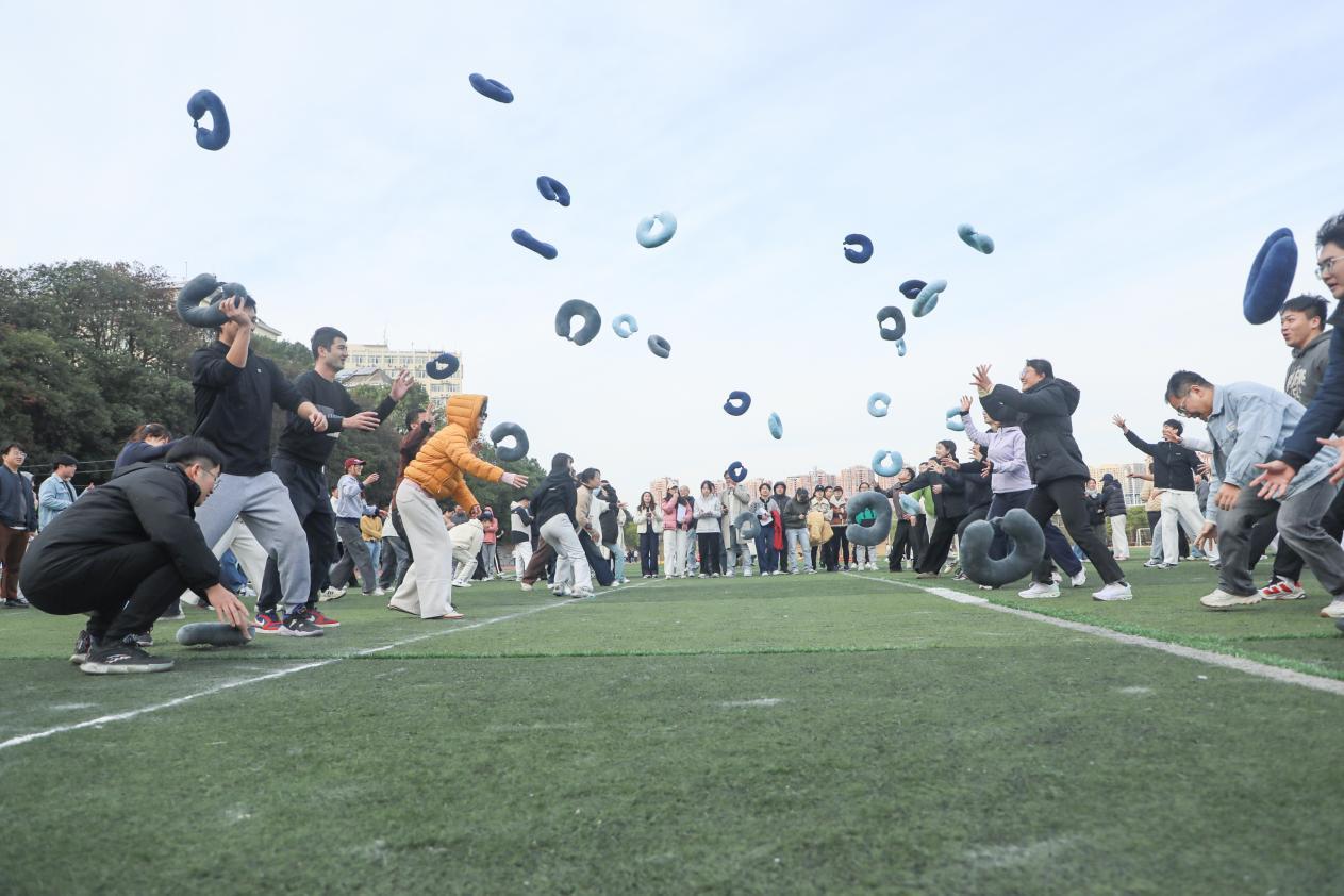 本次运动会集趣味性、协作性和竞技性于一体,赛事内容丰富多彩。在紧张刺激的分社区竞赛环节,各学生社区代表队在拔河比赛中展开力量的角逐与战术的较量,队员们口号响亮、齐心协力,践行着“团结就是力量”的真理。随后的枕头大战则充满了欢声笑语,枕头在空中飞舞,老师们释放压力,尽显活力。