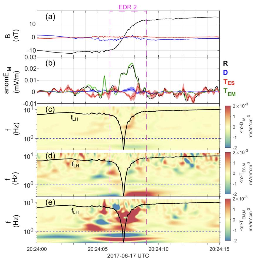 磁场重联是等离子体中磁场能量快速转化为粒子能量的关键物理机制,与太阳耀斑、地磁暴等爆发现象密切相关。电子扩散区作为磁场重联的“核心引擎”,其中能量耗散机制以及重联电场的来源,是揭示磁力线与等离子体解耦机制的关键科学问题。