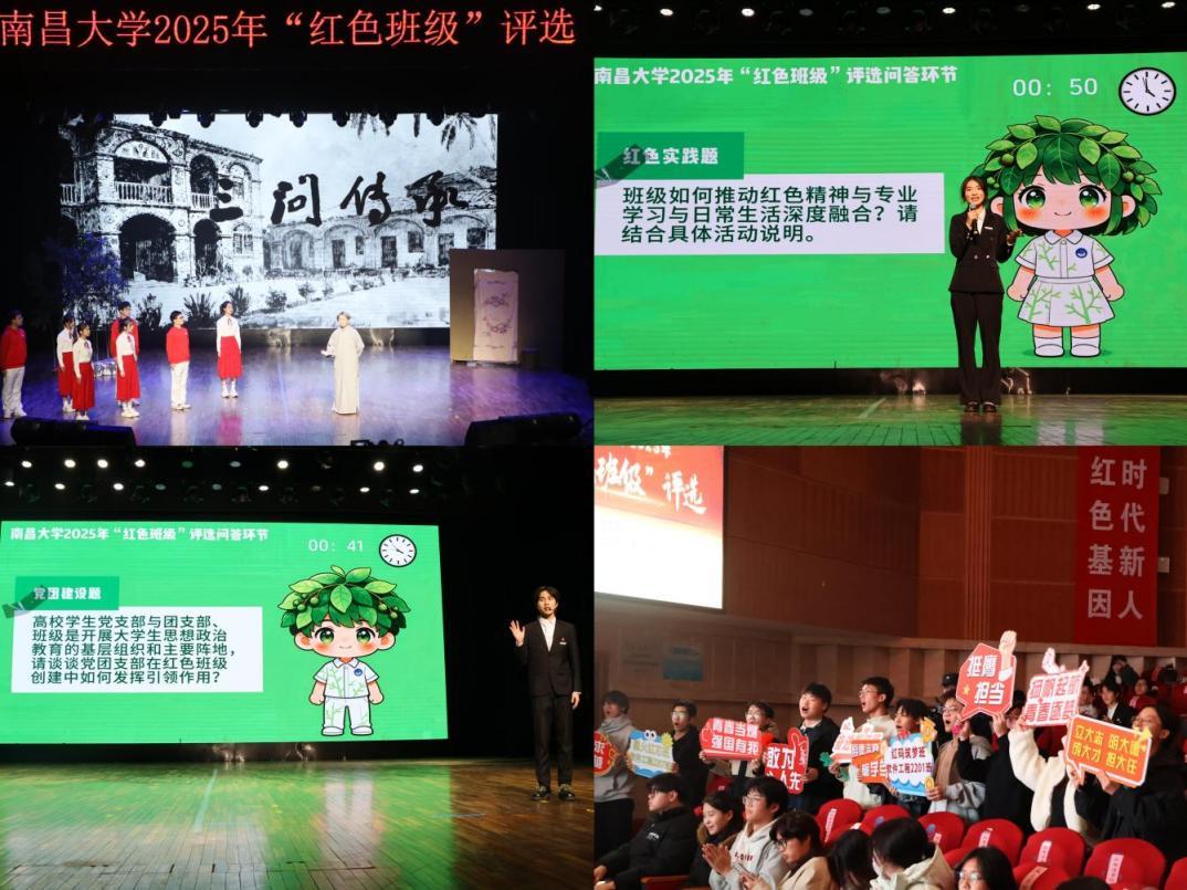 各班汇报集中展现了学校“学工牵头、学院落实、班级创建”工作推进思路的实践成效,也展现了各学院扎根江西红色沃土,将红色文化育人与学科建设深度融合的鲜明特色。人文学院哲学232班以“知行合一”为核心,构建“一核双环”红色育人体系,通过红色剧本杀、手账制作等实践活动践行马克思主义实践观;新闻与传播学院新闻学221班创新打造“天天播、周周谈、月月讲”学习模式,以“直播研学”形式走访革命旧址,产出多篇红色主题报道被主流媒体刊发;外国语学院英语(英日)234班“语你同行”志愿服务队通过选段翻译党的二十大报告,并进行多语种宣讲,成功入选国家级志愿服务队伍;焕奎书院2023级临床医学创新实验班秉承“报国济世”初心,研发痴呆症早期筛查模型服务社区居民,全员持证开展多项公益义诊与医疗保障服务,用专业所长践行红色使命。