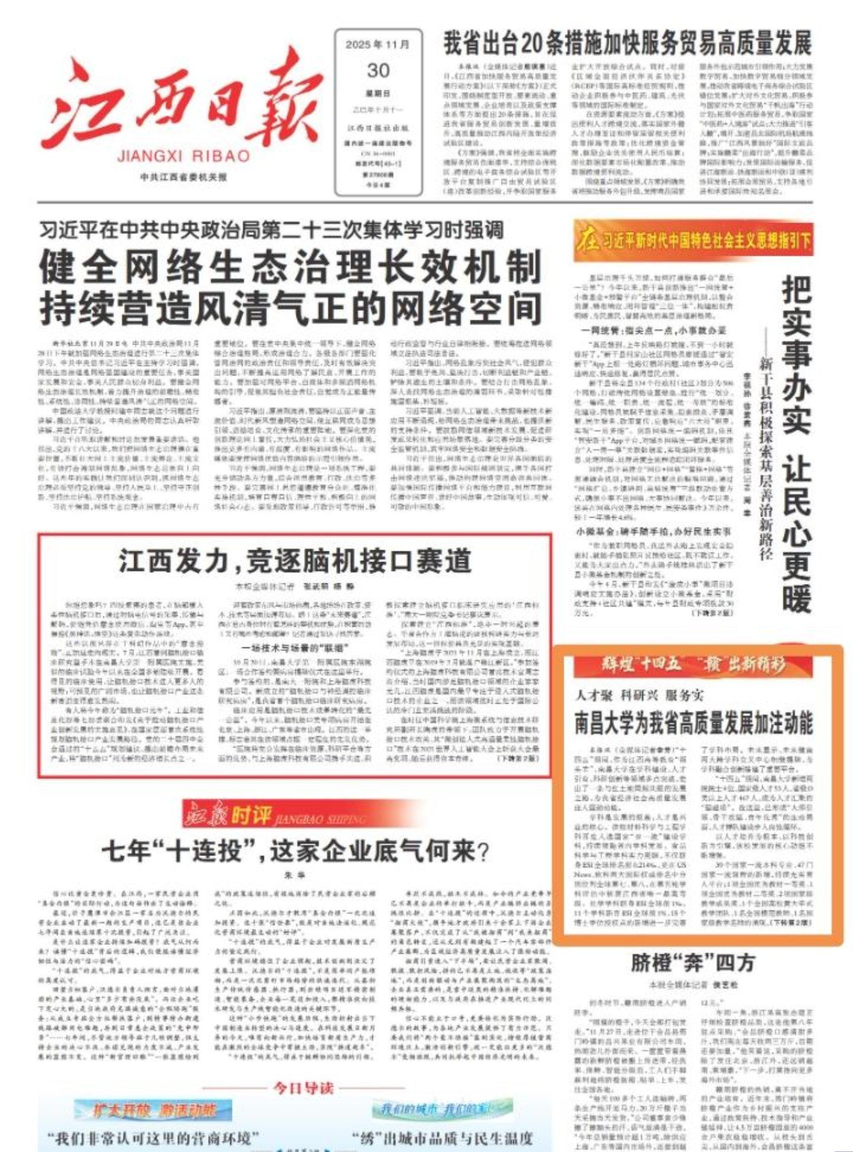 编者按:为深入学习贯彻党的二十届四中全会精神,全面落实习近平总书记关于教育的重要论述以及考察江西、视察南昌大学的重要讲话精神,回顾总结南昌大学“十四五”期间发展成就,科学谋划“十五五”时期发展蓝图,特开设【一路耕耘一路歌】专栏。专栏聚焦学校强化党的建设、深耕思政教育、夯实学科建设、建强人才队伍、推动文化传承、守护医疗健康、服务国家战略、助推地方发展、建设一流大学等方面推出系列报道,展现学校扎根红土地、奋进新时代的生动实践。本期发布《江西日报》头版刊发的题为《人才聚 科研兴 服务实 南昌大学为我省高质量发展注入动能》的文章,报道我校作为江西高等教育“领头羊”,“十四五”期间,在学科建设、人才引育、科研创新等领域多点突破,走出一条与红土地同频共振的发展之路,为江西经济社会高质量发展注入强劲动能。内容如下: