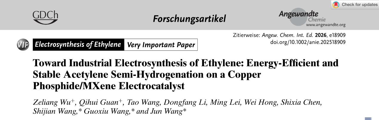 研究成果以“Towards Industrial Electrosynthesis of Ethylene: Energy-Efficient and Stable Acetylene Semi-Hydrogenation on a Copper Phosphide/MXene Electrocatalyst”以题发表于Angew. Chem. Int. Ed杂志上,被选为Very Important Paper。化学化工学院王珺教授、悉尼科技大学王时健博士以及汪国秀院士为本文共同通讯作者,博士生吴泽亮和管崎卉为该论文的共同第一作者。