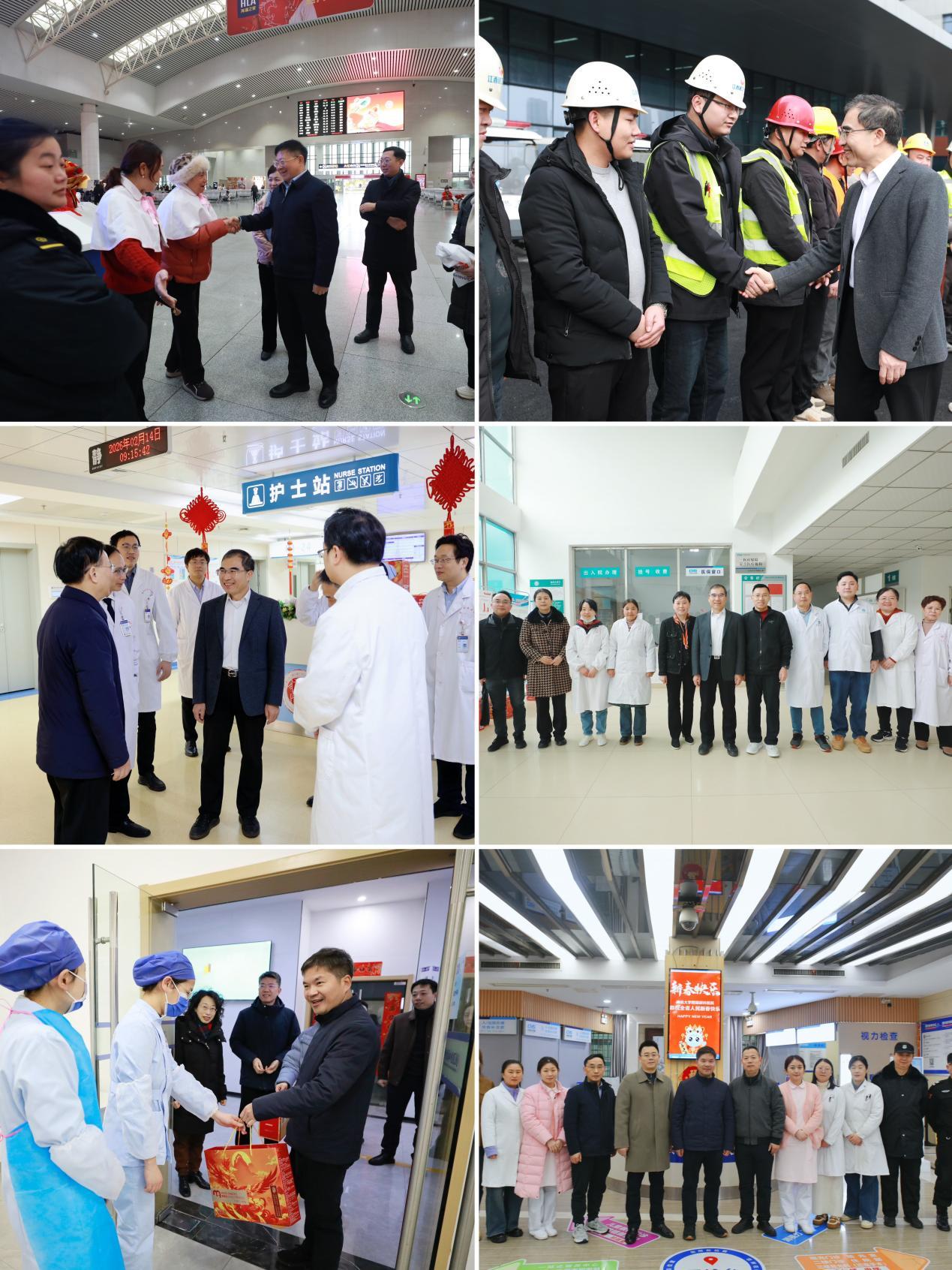 新春佳节之际,附属医院和校医院各项工作井然有序,高效运转,广大医务工作者坚守一线,默默奉献。校领导为大家送上祝福,充分肯定他们以仁心护佑生命、以匠心践行使命的职业精神,称赞大家在医疗服务、医学教育和科研创新等方面作出的积极贡献,仔细询问他们工作与生活情况,并勉励大家继续当好医学薪火的传递者、人民健康的守护人,为提高学校医学事业发展水平,为守护人民健康再立新功。校领导还专程前往南昌站看望附属康复医院“德凤天使健康行”医护志愿者们,感谢他们三十四年如一日用专业医术和无私爱心为春运之路筑起健康防线,并叮嘱大家在守护旅客健康的同时注意劳逸结合。