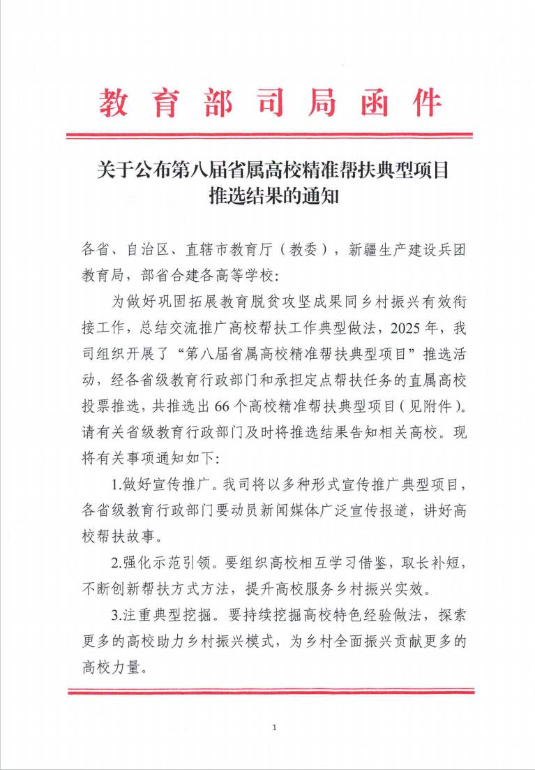 此次入选是我校继此前斩获相关荣誉后,再次获此殊荣,也是教育部对学校扎根基层开展精准帮扶工作、助力乡村振兴成效的高度认可,更是学校立足学科专业优势,主动服务地方经济社会发展的亮眼答卷。
