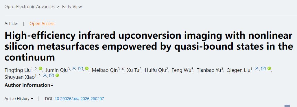 本网讯(信息工程学院)南昌大学信息工程学院成像与视觉表示研究团队在非线性光学成像领域取得重要研究进展。团队提出基于准连续域束缚态(Quasi-Bound States in the Continuum, Quasi-BICs)的硅基非线性超表面设计,实现了高效的红外上转换成像。相关成果以“High-efficiency infrared upconversion imaging with nonlinear silicon metasurfaces empowered by quasi-bound states in the continuum”为题,在线发表于光学领域国际顶级期刊Opto-Electronic Advances(影响因子:22.4)。