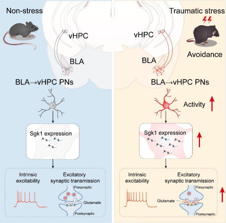 该团队通过模拟创伤应激发现,小鼠并不会立刻出现回避行为,而是在应激后约一周,这种行为才明显加剧。研究进一步揭示,这种迟发性的回避行为,与脑内基底外侧杏仁核(BLA)神经元活动逐渐增强的时间变化高度一致。更重要的是,这种变化并非普遍发生,而是具有明显的“定向性”:从杏仁核投射至腹侧海马(BLA→vHPC)的神经元被显著激活;而投射至另一脑区(伏隔核)的神经元则基本不受影响。通过特异性抑制BLA→vHPC这一特定神经元类群,可以有效减轻小鼠的回避行为。在分子层面,研究还发现,应激虽然只会短暂升高体内的应激激素(如皮质酮),却能够“启动”一条持续发挥作用的分子通路:通过激活糖皮质激素受体,选择性增强BLA→vHPC神经元中Sgk1分子的表达。在应激小鼠中抑制Sgk1可以阻断过度回避行为以及神经元的异常激活;相反,在正常小鼠BLA→vHPC神经元中提高Sgk1水平,虽然不会直接引发异常回避行为,但会显著增加机体对较弱应激刺激的敏感性。总体而言,这项研究从“脑连接环路”和“分子机制”两个层面,系统揭示了个体在经历创伤后应激事件后回避行为形成的神经机制,也为PTSD的早期预防和干预提供了新的思路和潜在靶点。