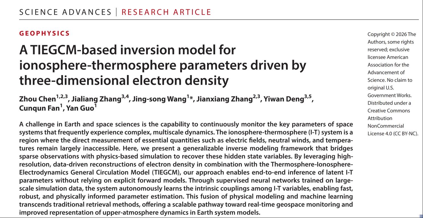 本网讯(信息工程学院)近日,由中国气象局牵头建设、南昌大学参与核心算法研发的“风宇”空间天气智能预报模型取得重要进展。其中,依托南昌大学空间科学与技术研究院和信息工程学院共同建设的“空间信息智能感知技术”教育部工程研究中心,陈洲教授团队完成了面向地球电离层—热层区域的一个关键模块研究,相关成果发表于国际知名学术期刊Science Advances。陈洲教授作为论文唯一第一作者,组织带领信息工程学院博士生和本科生开展科研攻关。该成果不仅标志着我国在空间天气智能预报、复杂地球空间系统状态反演以及国产人工智能平台支撑方面取得了新的突破,也体现了南昌大学在空间科学与人工智能交叉研究中的平台优势与协同创新成效。