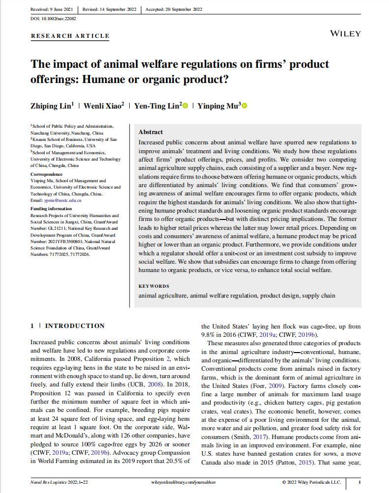 本网讯(公共政策与管理学院)近日,我校公共政策与管理学院青年教师林智平在政府动物福利法规对企业的产品供应、定价和利润的影响方面取得新的研究成果,研究论文“The impact of animal welfare regulations on firms' product offerings: Humane or organic product?”被国际权威期刊Naval Research Logistics(NRL)接收并在线发表(https://doi.org/10.1002/nav.22082)。
