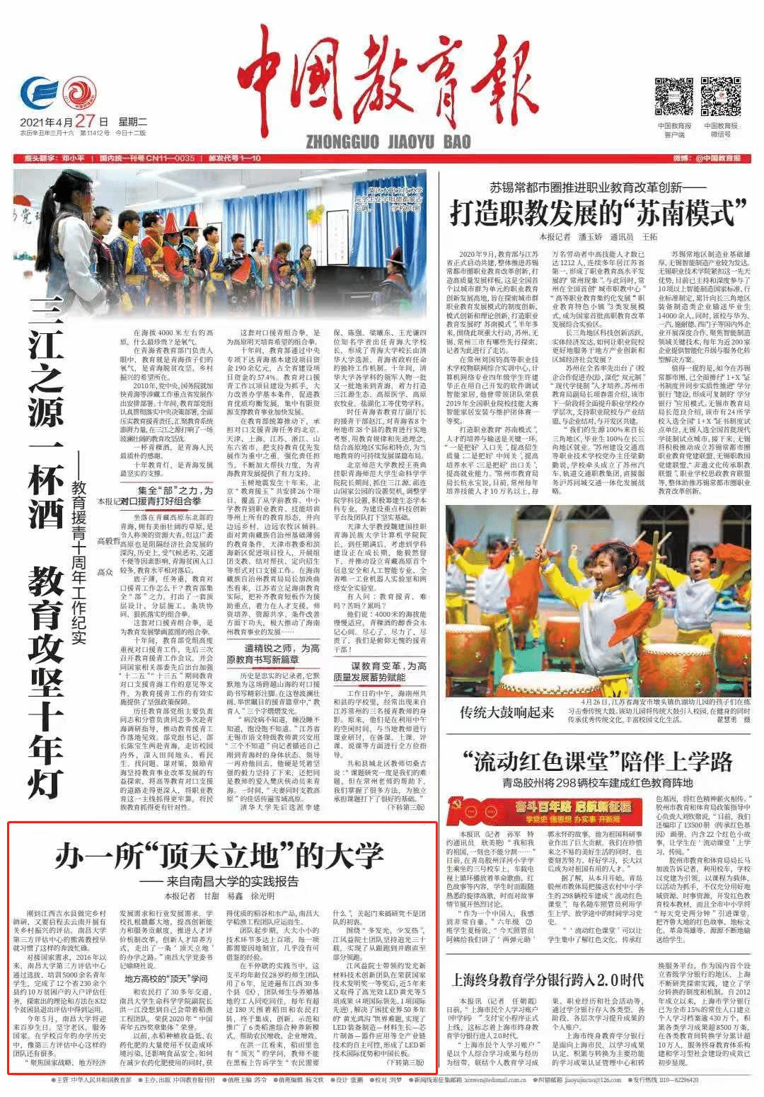 编者按:4月27日,《中国教育报》头版以《办一所“顶天立地”的大学——来自南昌大学的实践报告》为题,报道我校在教育教学、人才培养、科技创新、服务社会等方面改革发展成效。