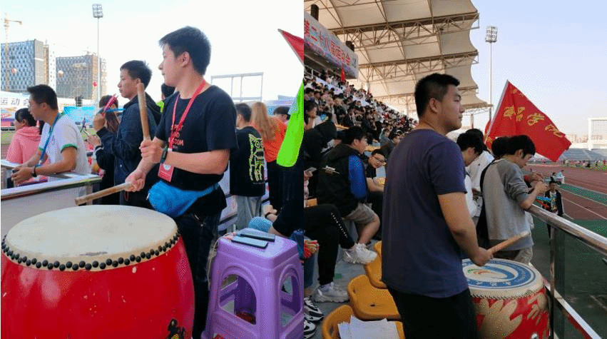 伴随着慷慨激昂的场内音乐,鼓手们奋力擂鼓,鼓声震天,表达着同学们热切的期盼,点燃了全场的激情。“我负责打鼓,我希望通过鼓声给他们打气,激发他们的斗志,以更好的状态投入比赛。”来自旅游管理202班的刘岳振告诉记者。