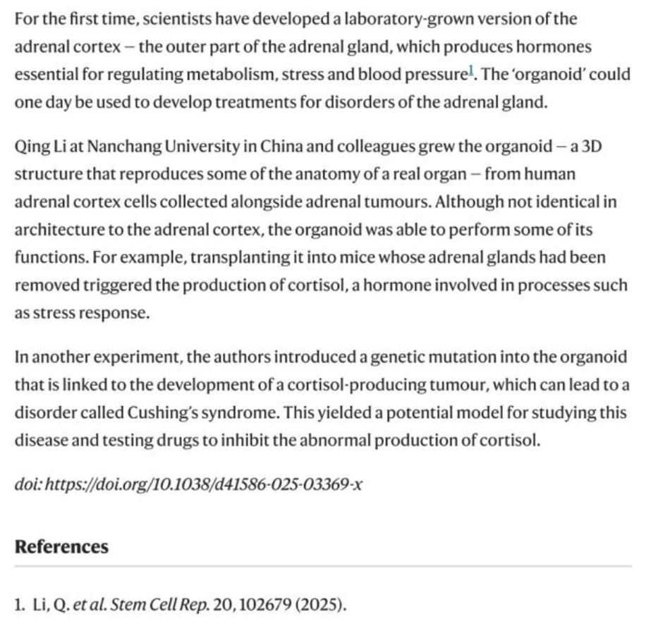 此项工作发表后,获Nature杂志高亮(highlight),撰文“Gland-in-a-dish secretes stress hormone like the real thing”指出:“科学家们首次在实验室培育出肾上腺皮质,这是肾上腺的最外层,可产生调节新陈代谢、应对压力和调节血压的必需激素。有朝一日,这种类器官也许能用来治疗肾上腺疾病……南昌大学用从肾上腺肿瘤附近采集的人类肾上腺皮质细胞培育出了肾上腺皮质类器官。研究结果是一个潜力巨大的模型,可用来研究这种疾病以及测试抑制皮质醇异常分泌的新药”。