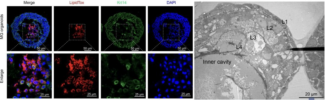 赵冰团队在睑板腺类器官与干眼症模型研究方面取得重要突破,于Protein & Cell杂志发表题为“Human meibomian gland organoids to study epithelial homeostasis and dysfunction”的研究文章,从头构建了可长期稳定扩增的小鼠及人睑板腺类器官,于体外完整还原了睑板腺细胞谱系及脂质分泌功能。