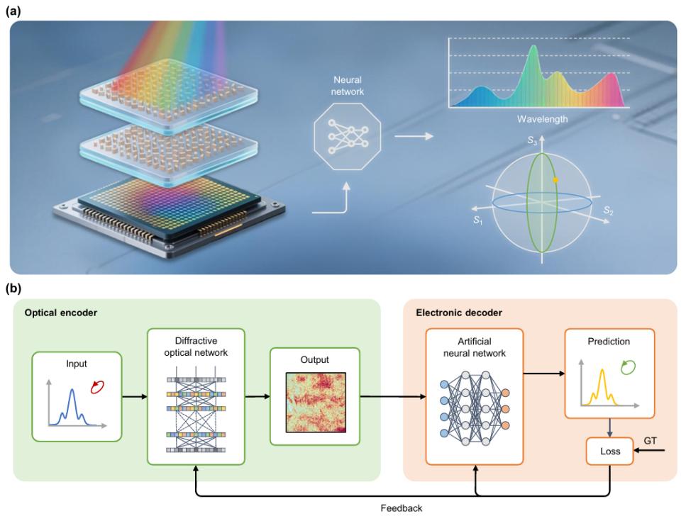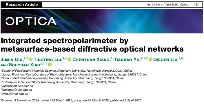 本网讯(物理与材料学院)近日,我校物理与材料学院、信息工程学院联合研究团队,在美国光学学会旗舰期刊Optica上发表题为“Integrated spectropolarimeter by metasurface-based diffractive optical networks”的最新研究成果,创新性提出了一种基于超表面的衍射光学网络的光谱偏振一体化传感器,该传感器能够在单个微型器件中同时完成光谱和偏振信息的测量,为多维光学传感技术的小型化和集成化开辟了新路径。