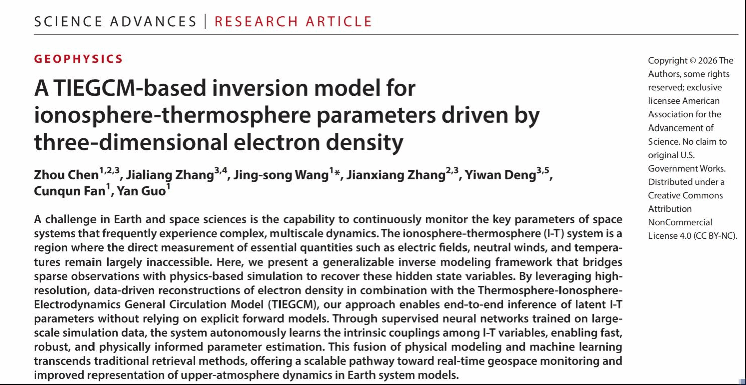 本网讯(信息工程学院)近日,由中国气象局牵头建设、南昌大学参与核心算法研发的“风宇”空间天气智能预报模型取得重要进展。其中,依托南昌大学空间科学与技术研究院和信息工程学院共同建设的“空间信息智能感知技术”教育部工程研究中心,陈洲教授团队完成了面向地球电离层—热层区域的一个关键模块研究,相关成果发表于国际知名学术期刊Science Advances。陈洲教授作为论文唯一第一作者,组织带领信息工程学院博士生和本科生开展科研攻关。该成果不仅标志着我国在空间天气智能预报、复杂地球空间系统状态反演以及国产人工智能平台支撑方面取得了新的突破,也体现了南昌大学在空间科学与人工智能交叉研究中的平台优势与协同创新成效。