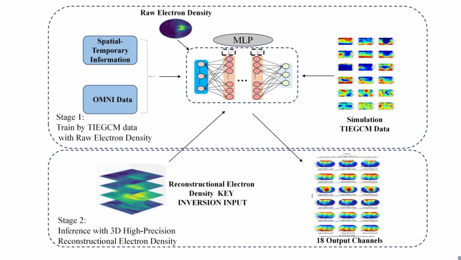 针对这一问题,陈洲教授团队提出了一种面向电离层—热层系统的端到端逆问题求解框架。研究利用高精度三维电子密度重建结果,并结合TIEGCM物理模型生成的大规模耦合数据,建立从可观测量到隐藏关键状态之间的直接映射关系,实现由电子密度反推出电场、中性风、中性温度等多个难以直接观测的关键参数。该方法不仅提升了传统参数反演能力,也为复杂空间环境系统提供了观测驱动的物理状态恢复新路径。