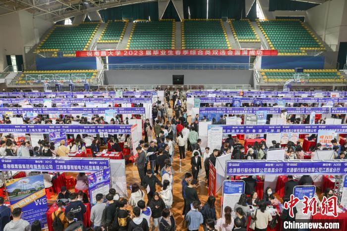 图为南昌大学2023届毕业生春季综合类双选会现场,不少学生在寻找工作机会。