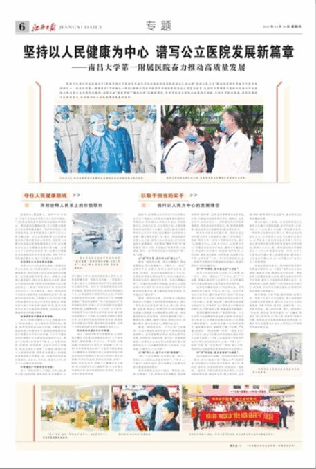 党的十九届六中全会通过了《中共中央关于党的百年奋斗重大成就和历史经验的决议》,决议将“坚持人民至上”概括为党的百年奋斗十条历史经验之一。南昌大学第一附属医院(下称南大一附院)坚持以习近平新时代中国特色社会主义思想为指导,认真学习贯彻落实党的十九届六中全会和江西省第十五次党代会精神,站在实施“健康中国”“健康江西”战略的高度,牢牢守住公立医院公益属性不动摇,不断筑牢民族昌盛、国家富强的人民健康基石,奋力谱写公立医院高质量发展新篇章。