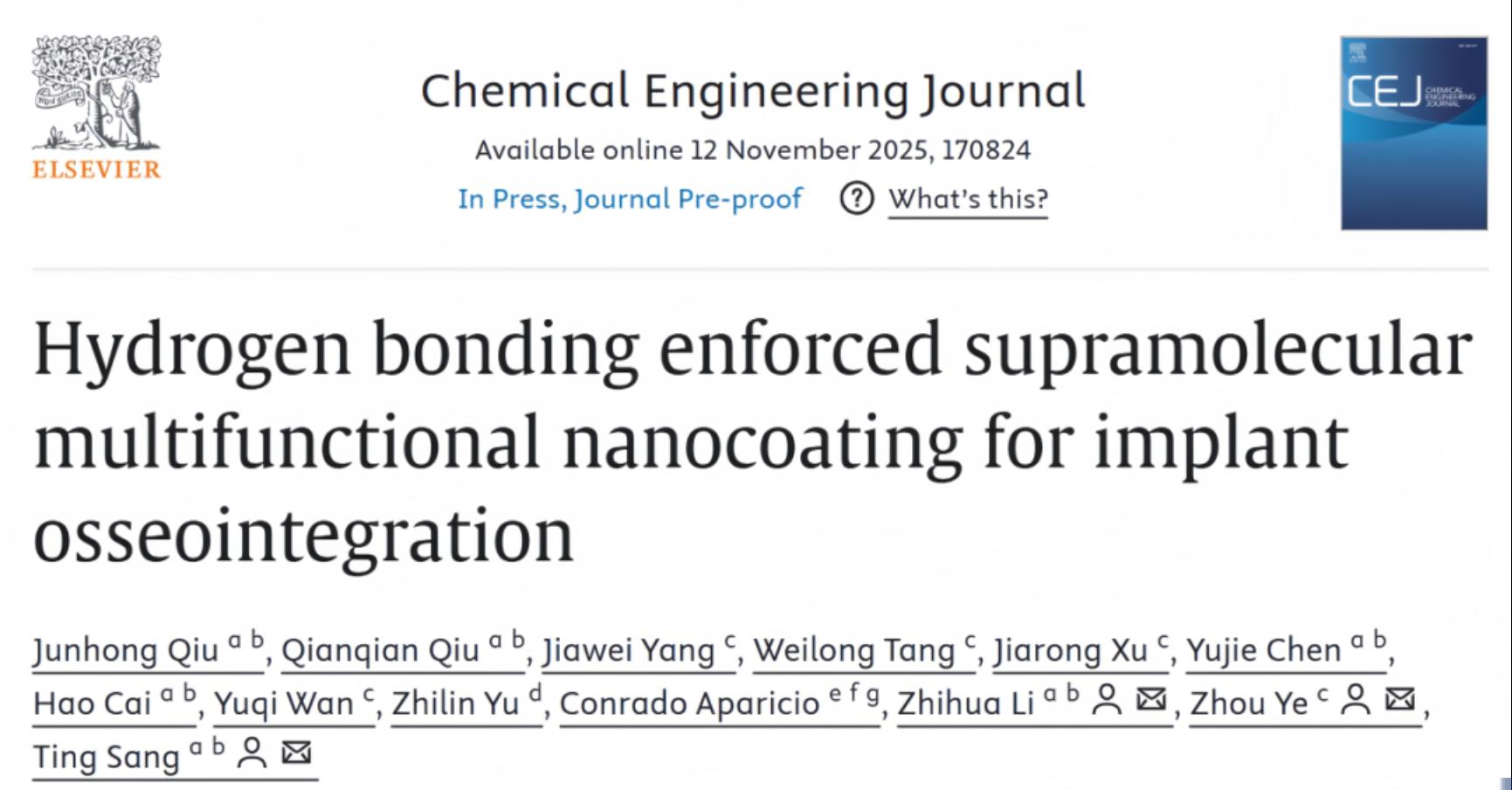 本网讯(口腔医(学)院 罗俊)近日,我校口腔正畸学科2022级硕士研究生邱君红以第一作者的身份在国际知名一区TOP期刊 《Chemical Engineering Journal》(影响因子13.2)发表题为“Hydrogen bonding enforced supramolecular multifunctional nanocoating for implant osseointegration”的研究论文。