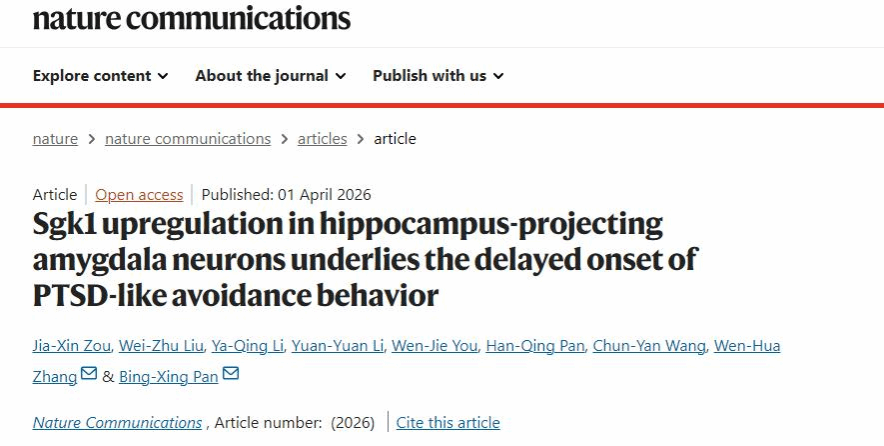 本网讯(生物医学创新研究院)近日,生物医学创新研究院潘秉兴/张文华研究员团队在Nature Communications期刊上发表了题为“Sgk1 upregulation in hippocampus-projecting amygdala neurons underlies the delayed onset of PTSD-like avoidance behavior”的研究论文,发现了大脑中一条负责迟发性“回避”行为的特定“环路”以及一个关键的分子“开关”,为理解和治疗PTSD提供了新思路。