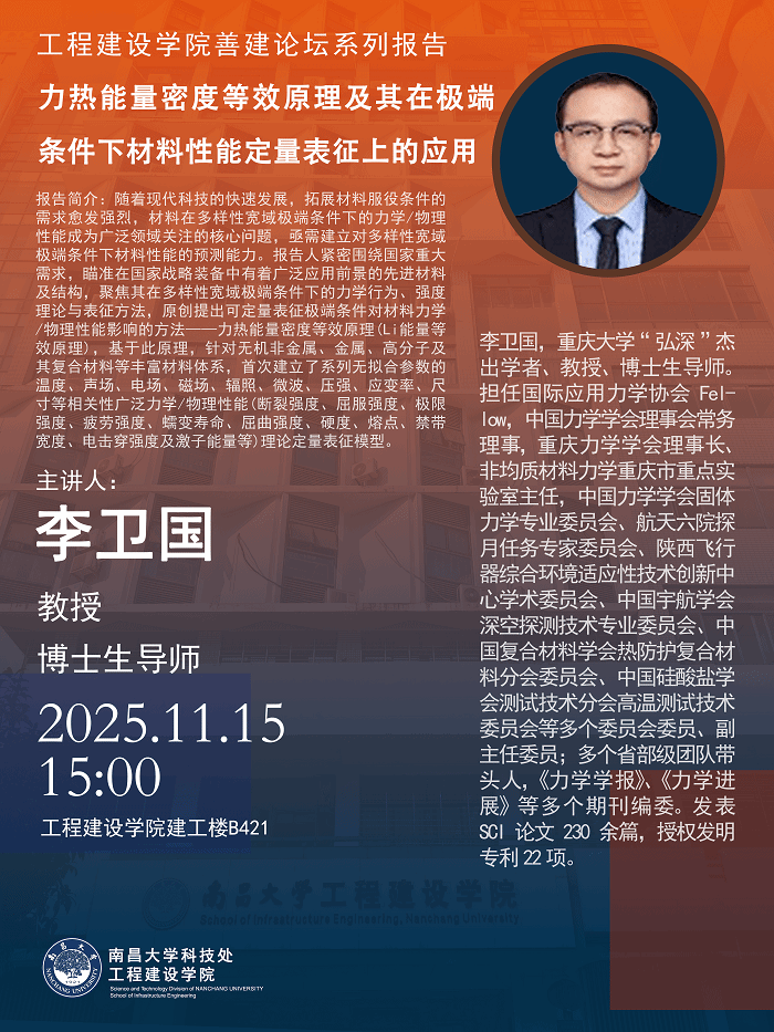 工程建设学院善建论坛系列报告:力热能量密度等效原理及其在极端条件下材料性能定量表征上的应用