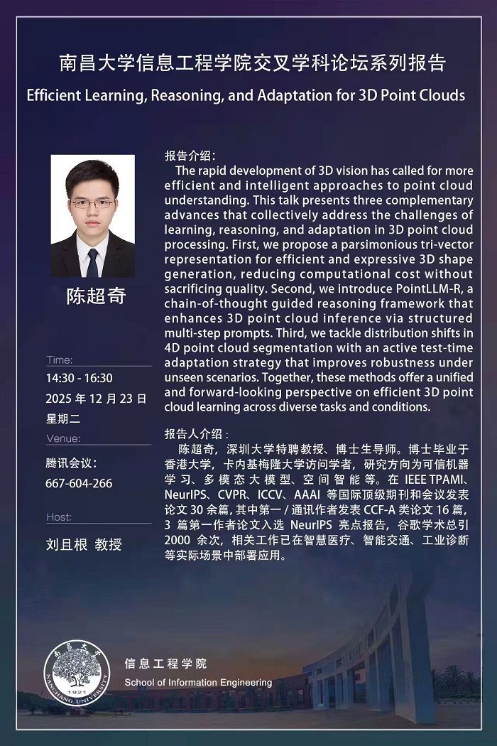 南昌大学信息工程学院交叉学科论坛系列报告:Efficient Learning, Reasoning, and Adaptation for 3D Point Clouds