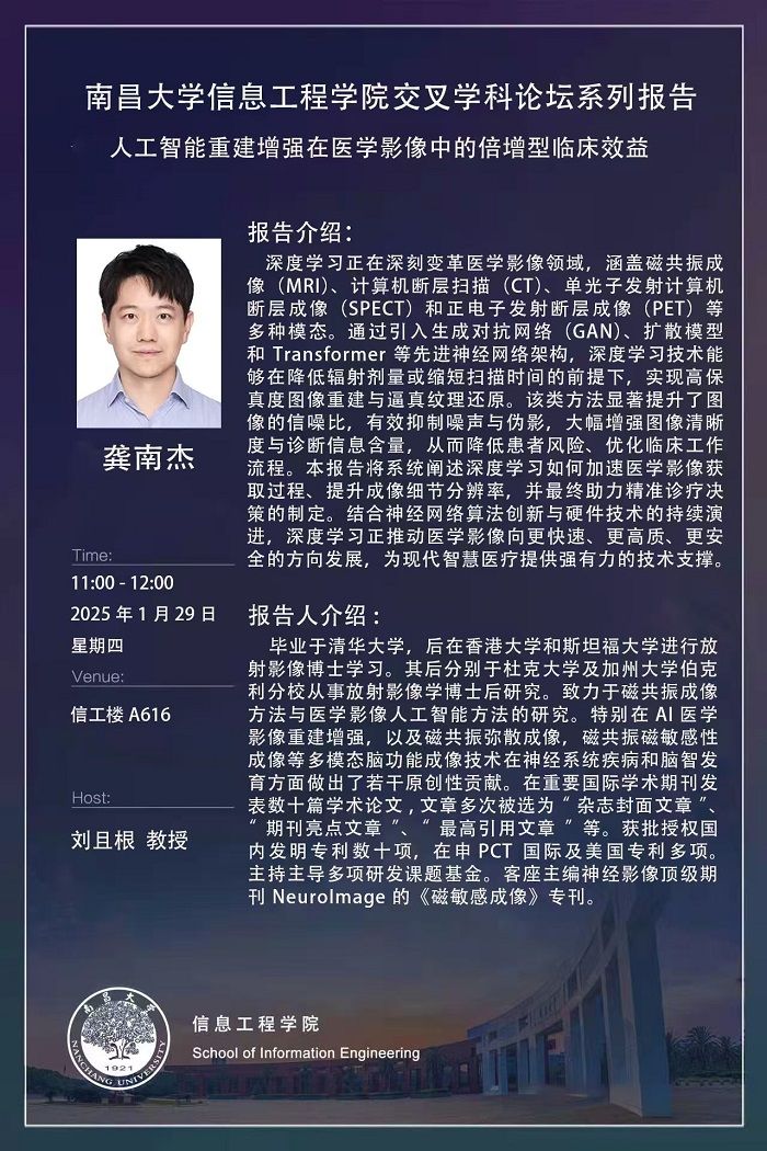 南昌大学信息工程学院交叉学科论坛系列报告:人工智能重建增强在医学影像中的倍增型临床效益
