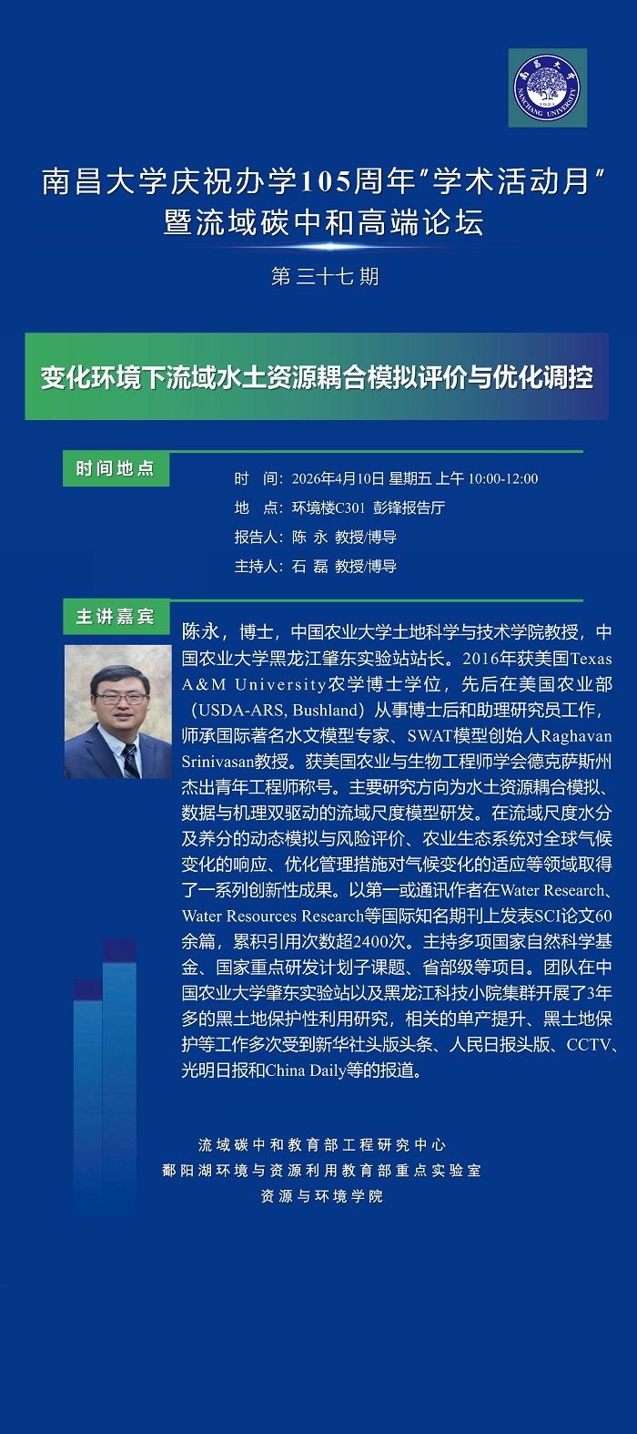 庆祝办学105周年“学术活动月”暨流域碳中和高端论坛— 2026年第37期 陈永教授