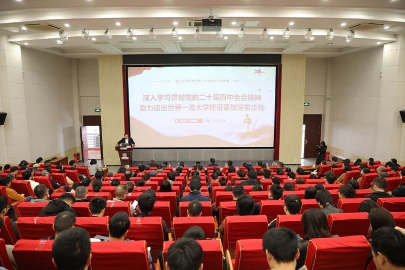 罗嗣海以《深入学习贯彻党的二十届四中全会精神 奋力迈出世界一流大学建设更加坚实步伐》为题,围绕全会重大意义,“十四五”时期发展成就,“十五五”时期的重要地位和我国发展环境变化,“十五五”时期经济社会发展的指导方针和主要目标、战略任务和重大举措、根本保证与重要保障以及中共江西省委十五届九次全体会议精神等方面,结合学校的发展实际,深入解读党的二十届四中全会精神,分析学校发展所面临的新形势新任务新目标,激励师生员工增强建设世界一流大学的内生动力,将全会精神转化为一流大学建设的实际行动。
